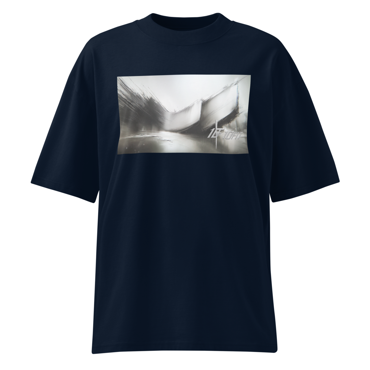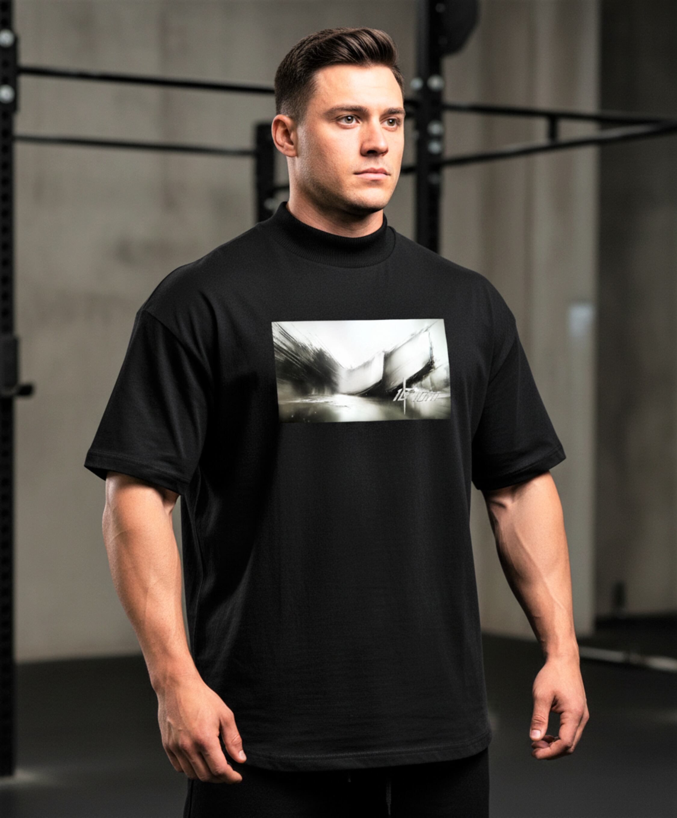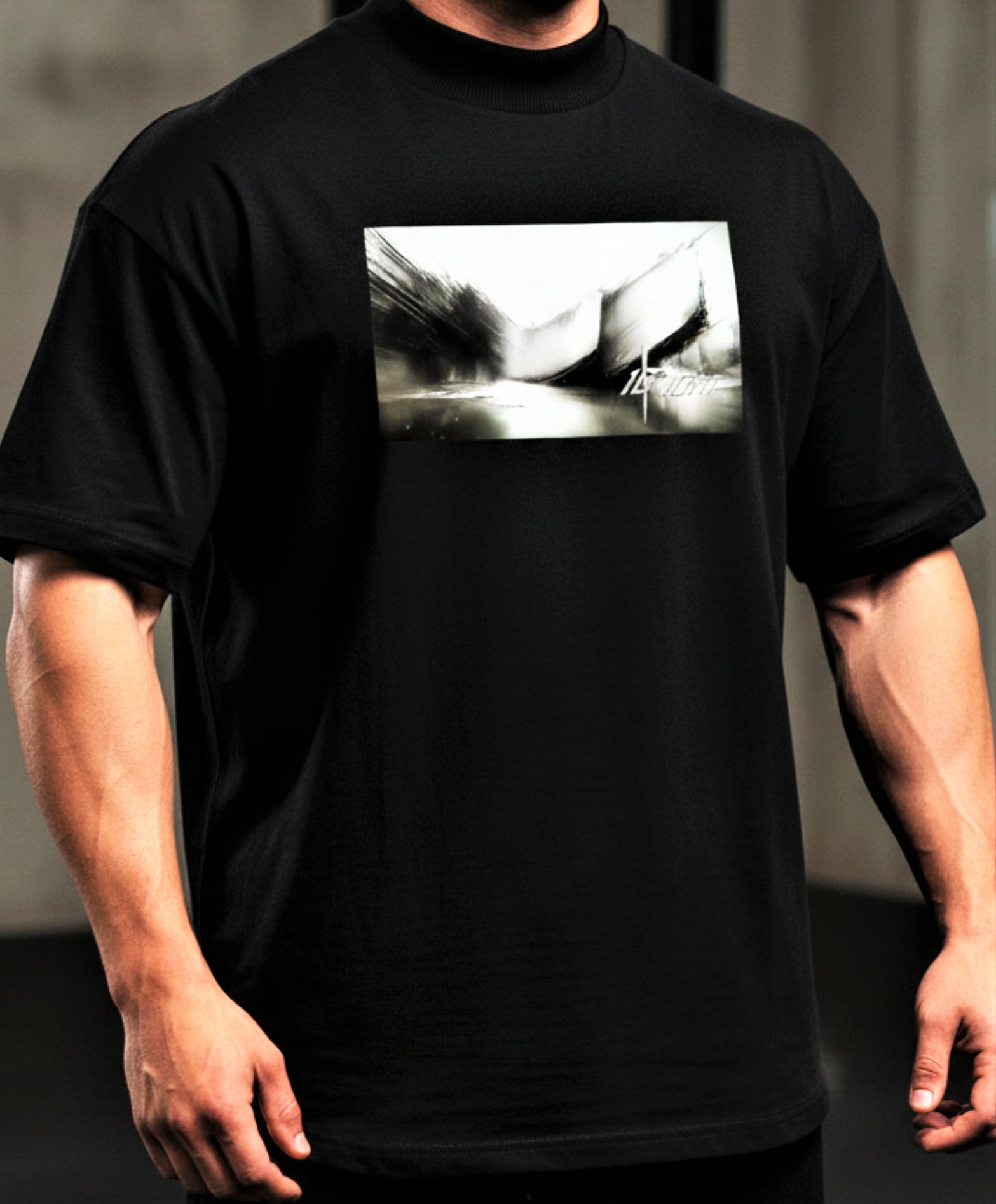 Tシャツのフロントにモノクロのアートデザインと10FITのロゴを印字。