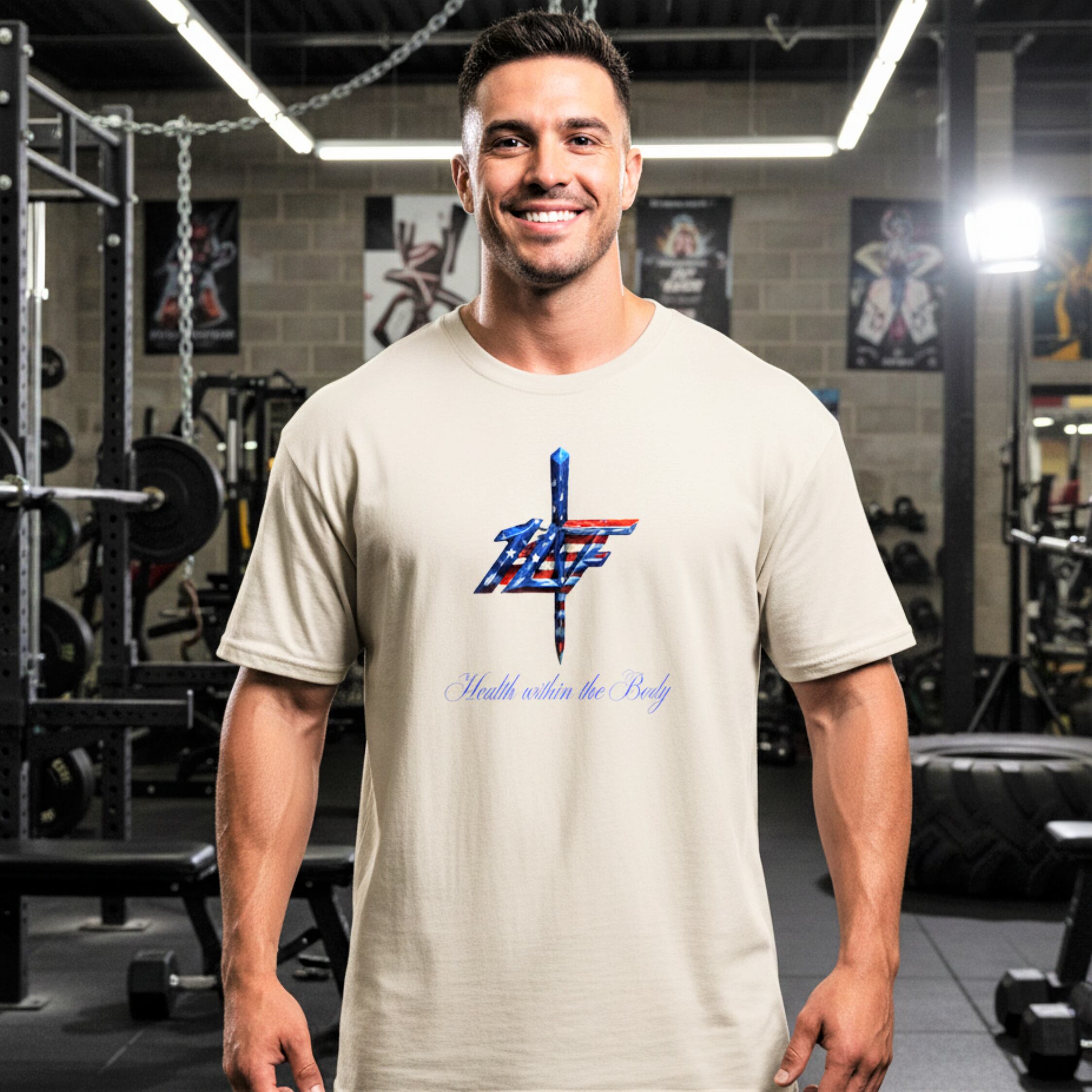 Tシャツのフロントにアメリカの国旗と10FITのロゴをミックスさせたデザインをプリント。